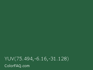 YUV 75.494,-6.16,-31.128 Color is a dark green color and the nearest color is Green Pea #1d6142. Hex code #28603f and RGB value is rgb(40,96,63). In RGB color space, this color is composed of 16% red, 38% green, 25% blue, In CMYK color space, this color is composed of 58% cyan, 0% magenta, 34% yellow , 62% black , In HSL color space, this color has a hue angle of 145° , 41% saturation and 27% lightness.