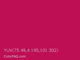 YUV 75.49,4.195,101.302 Color is a normal rose color and the nearest color is Pictorial Carmine #c30b4e. Hex code #bf0f54 and RGB value is rgb(191,15,84). In RGB color space, this color is composed of 75% red, 6% green, 33% blue, In CMYK color space, this color is composed of 0% cyan, 92% magenta, 56% yellow , 25% black , In HSL color space, this color has a hue angle of 336° , 85% saturation and 40% lightness.