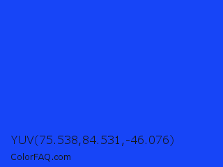 YUV 75.538,84.531,-46.076 Color is a normal blue color and the nearest color is Blue RYB #0247fe. Hex code #1745f7 and RGB value is rgb(23,69,247). In RGB color space, this color is composed of 9% red, 27% green, 97% blue, In CMYK color space, this color is composed of 91% cyan, 72% magenta, 0% yellow , 3% black , In HSL color space, this color has a hue angle of 228° , 93% saturation and 53% lightness.