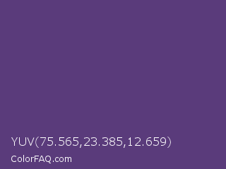YUV 75.565,23.385,12.659 Color is a normal violet color and the nearest color is Cyber Grape #58427c. Hex code #5a3b7b and RGB value is rgb(90,59,123). In RGB color space, this color is composed of 35% red, 23% green, 48% blue, In CMYK color space, this color is composed of 27% cyan, 52% magenta, 0% yellow , 52% black , In HSL color space, this color has a hue angle of 269° , 35% saturation and 36% lightness.