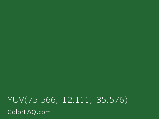 YUV 75.566,-12.111,-35.576 Color is a dark green color and the nearest color is Mughal Green #306030. Hex code #236533 and RGB value is rgb(35,101,51). In RGB color space, this color is composed of 14% red, 40% green, 20% blue, In CMYK color space, this color is composed of 65% cyan, 0% magenta, 50% yellow , 60% black , In HSL color space, this color has a hue angle of 135° , 49% saturation and 27% lightness.