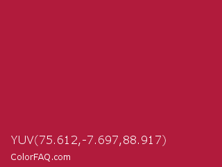 YUV 75.612,-7.697,88.917 Color is a normal red color and the nearest color is Deep Carmine #a9203e. Hex code #b11b3c and RGB value is rgb(177,27,60). In RGB color space, this color is composed of 69% red, 11% green, 24% blue, In CMYK color space, this color is composed of 0% cyan, 85% magenta, 66% yellow , 31% black , In HSL color space, this color has a hue angle of 347° , 74% saturation and 40% lightness.