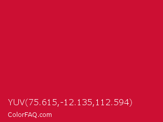 YUV 75.615,-12.135,112.594 Color is a normal red color and the nearest color is Vivid Crimson #cc0033. Hex code #cc0f33 and RGB value is rgb(204,15,51). In RGB color space, this color is composed of 80% red, 6% green, 20% blue, In CMYK color space, this color is composed of 0% cyan, 93% magenta, 75% yellow , 20% black , In HSL color space, this color has a hue angle of 349° , 86% saturation and 43% lightness.