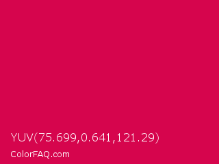 YUV 75.699,0.641,121.29 Color is a normal rose color and the nearest color is UA Red #d9004c. Hex code #d6054d and RGB value is rgb(214,5,77). In RGB color space, this color is composed of 84% red, 2% green, 30% blue, In CMYK color space, this color is composed of 0% cyan, 98% magenta, 64% yellow , 16% black , In HSL color space, this color has a hue angle of 339° , 95% saturation and 43% lightness.