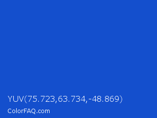 YUV 75.723,63.734,-48.869 Color is a normal blue color and the nearest color is New Car #214fc6. Hex code #144fcd and RGB value is rgb(20,79,205). In RGB color space, this color is composed of 8% red, 31% green, 80% blue, In CMYK color space, this color is composed of 90% cyan, 61% magenta, 0% yellow , 20% black , In HSL color space, this color has a hue angle of 221° , 82% saturation and 44% lightness.