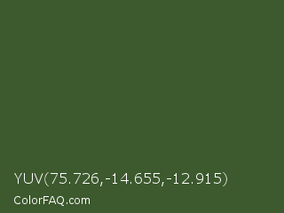 YUV 75.726,-14.655,-12.915 Color is a dark green color and the nearest color is Tom Thumb #3f583b. Hex code #3d592e and RGB value is rgb(61,89,46). In RGB color space, this color is composed of 24% red, 35% green, 18% blue, In CMYK color space, this color is composed of 31% cyan, 0% magenta, 48% yellow , 65% black , In HSL color space, this color has a hue angle of 99° , 32% saturation and 26% lightness.