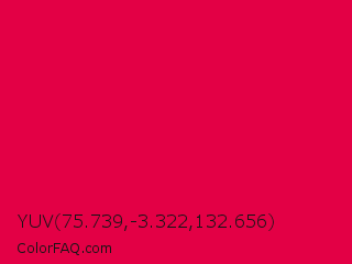 YUV 75.739,-3.322,132.656 Color is a normal rose color and the nearest color is UA Red #d9004c. Hex code #e30045 and RGB value is rgb(227,-0,69). In RGB color space, this color is composed of 89% red, 0% green, 27% blue, In CMYK color space, this color is composed of 0% cyan, 100% magenta, 70% yellow , 11% black , In HSL color space, this color has a hue angle of 342° , 100% saturation and 45% lightness.