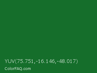 YUV 75.751,-16.146,-48.017 Color is a dark green color and the nearest color is La Salle Green #087830. Hex code #156e2b and RGB value is rgb(21,110,43). In RGB color space, this color is composed of 8% red, 43% green, 17% blue, In CMYK color space, this color is composed of 81% cyan, 0% magenta, 61% yellow , 57% black , In HSL color space, this color has a hue angle of 135° , 68% saturation and 26% lightness.