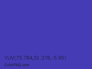 YUV 75.784,51.378,-5.95 Color is a normal indigo color and the nearest color is Ocean Blue #4f42b5. Hex code #453bb4 and RGB value is rgb(69,59,180). In RGB color space, this color is composed of 27% red, 23% green, 71% blue, In CMYK color space, this color is composed of 62% cyan, 67% magenta, 0% yellow , 29% black , In HSL color space, this color has a hue angle of 245° , 51% saturation and 47% lightness.