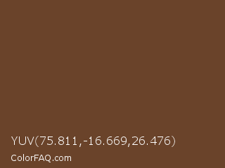 YUV 75.811,-16.669,26.476 Color is a dark orange color and the nearest color is Spice #6a442e. Hex code #6a432a and RGB value is rgb(106,67,42). In RGB color space, this color is composed of 42% red, 26% green, 16% blue, In CMYK color space, this color is composed of 0% cyan, 37% magenta, 60% yellow , 58% black , In HSL color space, this color has a hue angle of 23° , 43% saturation and 29% lightness.