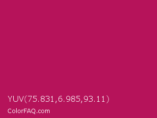 YUV 75.831,6.985,93.11 Color is a normal rose color and the nearest color is Rose Red #c21e56. Hex code #b6135a and RGB value is rgb(182,19,90). In RGB color space, this color is composed of 71% red, 7% green, 35% blue, In CMYK color space, this color is composed of 0% cyan, 90% magenta, 51% yellow , 29% black , In HSL color space, this color has a hue angle of 334° , 81% saturation and 39% lightness.