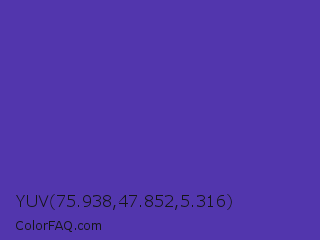 YUV 75.938,47.852,5.316 Color is a normal indigo color and the nearest color is Ocean Blue #4f42b5. Hex code #5236ad and RGB value is rgb(82,54,173). In RGB color space, this color is composed of 32% red, 21% green, 68% blue, In CMYK color space, this color is composed of 53% cyan, 69% magenta, 0% yellow , 32% black , In HSL color space, this color has a hue angle of 254° , 52% saturation and 45% lightness.