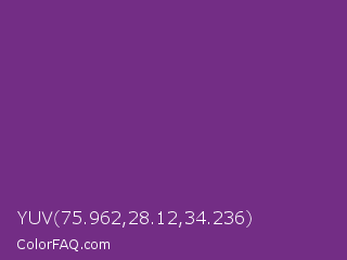 YUV 75.962,28.12,34.236 Color is a normal purple color and the nearest color is Maximum Purple #733380. Hex code #732d85 and RGB value is rgb(115,45,133). In RGB color space, this color is composed of 45% red, 18% green, 52% blue, In CMYK color space, this color is composed of 14% cyan, 66% magenta, 0% yellow , 48% black , In HSL color space, this color has a hue angle of 288° , 49% saturation and 35% lightness.