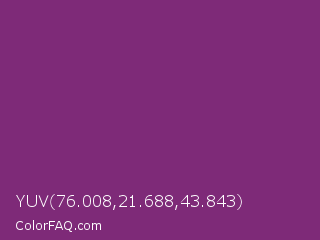 YUV 76.008,21.688,43.843 Color is a normal magenta color and the nearest color is Razzmic Berry Crayola #843179. Hex code #7e2a78 and RGB value is rgb(126,42,120). In RGB color space, this color is composed of 49% red, 16% green, 47% blue, In CMYK color space, this color is composed of 0% cyan, 67% magenta, 5% yellow , 51% black , In HSL color space, this color has a hue angle of 304° , 50% saturation and 33% lightness.