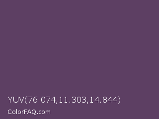 YUV 76.074,11.303,14.844 Color is a normal purple color and the nearest color is English Violet #563c5c. Hex code #5d3f63 and RGB value is rgb(93,63,99). In RGB color space, this color is composed of 36% red, 25% green, 39% blue, In CMYK color space, this color is composed of 6% cyan, 36% magenta, 0% yellow , 61% black , In HSL color space, this color has a hue angle of 290° , 22% saturation and 32% lightness.