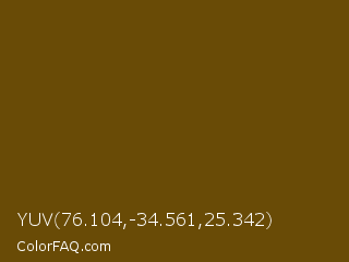 YUV 76.104,-34.561,25.342 Color is a very dark orange color and the nearest color is Antique Bronze #704a07. Hex code #694b06 and RGB value is rgb(105,75,6). In RGB color space, this color is composed of 41% red, 29% green, 2% blue, In CMYK color space, this color is composed of 0% cyan, 29% magenta, 94% yellow , 59% black , In HSL color space, this color has a hue angle of 42° , 89% saturation and 22% lightness.