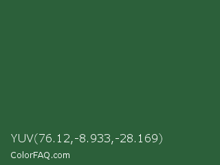 YUV 76.12,-8.933,-28.169 Color is a dark green color and the nearest color is Hunter Green #355e3b. Hex code #2c603a and RGB value is rgb(44,96,58). In RGB color space, this color is composed of 17% red, 38% green, 23% blue, In CMYK color space, this color is composed of 54% cyan, 0% magenta, 40% yellow , 62% black , In HSL color space, this color has a hue angle of 136° , 37% saturation and 27% lightness.