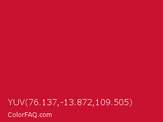YUV 76.137,-13.872,109.505 Color is a normal red color and the nearest color is Cardinal #c41e3a. Hex code #c91230 and RGB value is rgb(201,18,48). In RGB color space, this color is composed of 79% red, 7% green, 19% blue, In CMYK color space, this color is composed of 0% cyan, 91% magenta, 76% yellow , 21% black , In HSL color space, this color has a hue angle of 350° , 84% saturation and 43% lightness.