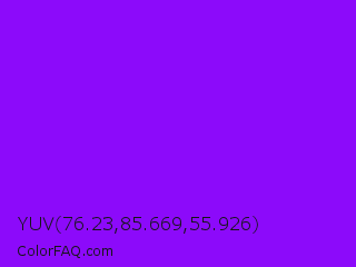 YUV 76.23,85.669,55.926 Color is a normal purple color and the nearest color is Electric Violet #8b00ff. Hex code #8c0afa and RGB value is rgb(140,10,250). In RGB color space, this color is composed of 55% red, 4% green, 98% blue, In CMYK color space, this color is composed of 44% cyan, 96% magenta, 0% yellow , 2% black , In HSL color space, this color has a hue angle of 273° , 96% saturation and 51% lightness.