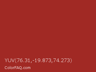YUV 76.31,-19.873,74.273 Color is a normal red color and the nearest color is Mexican Red #a72525. Hex code #a12924 and RGB value is rgb(161,41,36). In RGB color space, this color is composed of 63% red, 16% green, 14% blue, In CMYK color space, this color is composed of 0% cyan, 75% magenta, 78% yellow , 37% black , In HSL color space, this color has a hue angle of 2° , 63% saturation and 39% lightness.