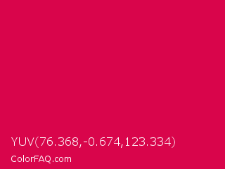 YUV 76.368,-0.674,123.334 Color is a normal rose color and the nearest color is UA Red #d9004c. Hex code #d9054b and RGB value is rgb(217,5,75). In RGB color space, this color is composed of 85% red, 2% green, 29% blue, In CMYK color space, this color is composed of 0% cyan, 98% magenta, 65% yellow , 15% black , In HSL color space, this color has a hue angle of 340° , 95% saturation and 44% lightness.