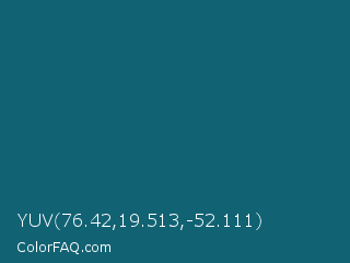 YUV 76.42,19.513,-52.111 Color is a dark cyan color and the nearest color is Blue Sapphire #126180. Hex code #116374 and RGB value is rgb(17,99,116). In RGB color space, this color is composed of 7% red, 39% green, 45% blue, In CMYK color space, this color is composed of 85% cyan, 15% magenta, 0% yellow , 55% black , In HSL color space, this color has a hue angle of 190° , 74% saturation and 26% lightness.