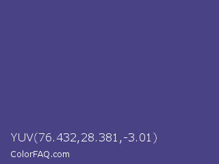 YUV 76.432,28.381,-3.01 Color is a normal indigo color and the nearest color is Dark Slate Blue #483d8b. Hex code #494386 and RGB value is rgb(73,67,134). In RGB color space, this color is composed of 29% red, 26% green, 53% blue, In CMYK color space, this color is composed of 46% cyan, 50% magenta, 0% yellow , 47% black , In HSL color space, this color has a hue angle of 245° , 33% saturation and 39% lightness.