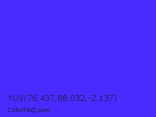 YUV 76.437,88.032,-2.137 Color is a normal indigo color and the nearest color is Han Purple #5218fa. Hex code #4a2bff and RGB value is rgb(74,43,255). In RGB color space, this color is composed of 29% red, 17% green, 100% blue, In CMYK color space, this color is composed of 71% cyan, 83% magenta, 0% yellow , 0% black , In HSL color space, this color has a hue angle of 249° , 100% saturation and 58% lightness.