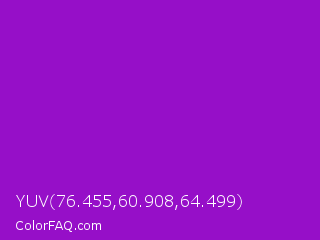YUV 76.455,60.908,64.499 Color is a normal purple color and the nearest color is French Violet #8806ce. Hex code #960fc8 and RGB value is rgb(150,15,200). In RGB color space, this color is composed of 59% red, 6% green, 78% blue, In CMYK color space, this color is composed of 25% cyan, 93% magenta, 0% yellow , 22% black , In HSL color space, this color has a hue angle of 284° , 86% saturation and 42% lightness.