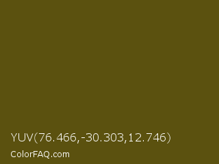 YUV 76.466,-30.303,12.746 Color is a very dark yellow color and the nearest color is Horses Neck #604913. Hex code #5b510f and RGB value is rgb(91,81,15). In RGB color space, this color is composed of 36% red, 32% green, 6% blue, In CMYK color space, this color is composed of 0% cyan, 11% magenta, 84% yellow , 64% black , In HSL color space, this color has a hue angle of 52° , 72% saturation and 21% lightness.