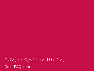 YUV 76.4,-2.662,107.52 Color is a normal rose color and the nearest color is Pictorial Carmine #c30b4e. Hex code #c70f47 and RGB value is rgb(199,15,71). In RGB color space, this color is composed of 78% red, 6% green, 28% blue, In CMYK color space, this color is composed of 0% cyan, 92% magenta, 64% yellow , 22% black , In HSL color space, this color has a hue angle of 342° , 86% saturation and 42% lightness.