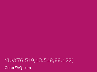 YUV 76.519,13.548,88.122 Color is a normal rose color and the nearest color is Lipstick #ab0563. Hex code #b11468 and RGB value is rgb(177,20,104). In RGB color space, this color is composed of 69% red, 8% green, 41% blue, In CMYK color space, this color is composed of 0% cyan, 89% magenta, 41% yellow , 31% black , In HSL color space, this color has a hue angle of 328° , 80% saturation and 39% lightness.