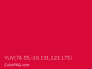YUV 76.55,-10.131,123.175 Color is a normal red color and the nearest color is Crimson #dc143c. Hex code #d90938 and RGB value is rgb(217,9,56). In RGB color space, this color is composed of 85% red, 4% green, 22% blue, In CMYK color space, this color is composed of 0% cyan, 96% magenta, 74% yellow , 15% black , In HSL color space, this color has a hue angle of 346° , 92% saturation and 44% lightness.