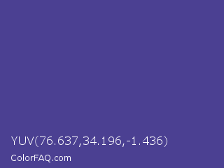 YUV 76.637,34.196,-1.436 Color is a normal indigo color and the nearest color is Dark Slate Blue #483d8b. Hex code #4b4092 and RGB value is rgb(75,64,146). In RGB color space, this color is composed of 29% red, 25% green, 57% blue, In CMYK color space, this color is composed of 49% cyan, 56% magenta, 0% yellow , 43% black , In HSL color space, this color has a hue angle of 248° , 39% saturation and 41% lightness.