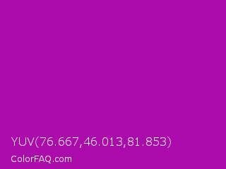 YUV 76.667,46.013,81.853 Color is a normal magenta color and the nearest color is Heliotrope Magenta #aa00bb. Hex code #aa0baa and RGB value is rgb(170,11,170). In RGB color space, this color is composed of 67% red, 4% green, 67% blue, In CMYK color space, this color is composed of 0% cyan, 94% magenta, 0% yellow , 33% black , In HSL color space, this color has a hue angle of 300° , 88% saturation and 35% lightness.