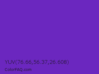 YUV 76.66,56.37,26.608 Color is a normal violet color and the nearest color is Purple Heart Crayola #652dc1. Hex code #6b27bf and RGB value is rgb(107,39,191). In RGB color space, this color is composed of 42% red, 15% green, 75% blue, In CMYK color space, this color is composed of 44% cyan, 80% magenta, 0% yellow , 25% black , In HSL color space, this color has a hue angle of 267° , 66% saturation and 45% lightness.
