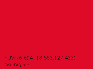 YUV 76.694,-18.583,127.433 Color is a normal red color and the nearest color is Medium Candy Apple Red #e2062c. Hex code #de0a27 and RGB value is rgb(222,10,39). In RGB color space, this color is composed of 87% red, 4% green, 15% blue, In CMYK color space, this color is composed of 0% cyan, 95% magenta, 82% yellow , 13% black , In HSL color space, this color has a hue angle of 352° , 91% saturation and 45% lightness.