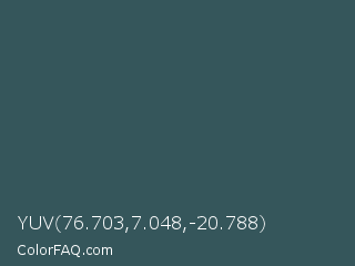 YUV 76.703,7.048,-20.788 Color is a dark cyan color and the nearest color is Spectra #2f5a57. Hex code #35565b and RGB value is rgb(53,86,91). In RGB color space, this color is composed of 21% red, 34% green, 36% blue, In CMYK color space, this color is composed of 42% cyan, 5% magenta, 0% yellow , 64% black , In HSL color space, this color has a hue angle of 188° , 26% saturation and 28% lightness.
