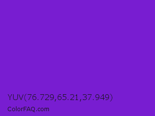 YUV 76.729,65.21,37.949 Color is a normal violet color and the nearest color is French Violet #8806ce. Hex code #781dd1 and RGB value is rgb(120,29,209). In RGB color space, this color is composed of 47% red, 11% green, 82% blue, In CMYK color space, this color is composed of 43% cyan, 86% magenta, 0% yellow , 18% black , In HSL color space, this color has a hue angle of 270° , 76% saturation and 47% lightness.