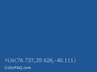 YUV 76.737,35.626,-40.111 Color is a normal blue color and the nearest color is Cyan Cobalt Blue #28589c. Hex code #1f5695 and RGB value is rgb(31,86,149). In RGB color space, this color is composed of 12% red, 34% green, 58% blue, In CMYK color space, this color is composed of 79% cyan, 42% magenta, 0% yellow , 42% black , In HSL color space, this color has a hue angle of 212° , 66% saturation and 35% lightness.