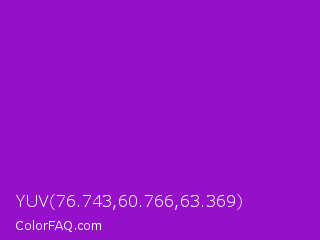 YUV 76.743,60.766,63.369 Color is a normal purple color and the nearest color is French Violet #8806ce. Hex code #9510c8 and RGB value is rgb(149,16,200). In RGB color space, this color is composed of 58% red, 6% green, 78% blue, In CMYK color space, this color is composed of 26% cyan, 92% magenta, 0% yellow , 22% black , In HSL color space, this color has a hue angle of 283° , 85% saturation and 42% lightness.