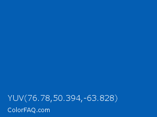 YUV 76.78,50.394,-63.828 Color is a normal blue color and the nearest color is Green Blue #1164b4. Hex code #045eb3 and RGB value is rgb(4,94,179). In RGB color space, this color is composed of 2% red, 37% green, 70% blue, In CMYK color space, this color is composed of 98% cyan, 47% magenta, 0% yellow , 30% black , In HSL color space, this color has a hue angle of 209° , 96% saturation and 36% lightness.