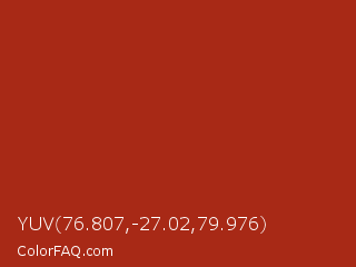 YUV 76.807,-27.02,79.976 Color is a normal red color and the nearest color is Tabasco #a02712. Hex code #a82916 and RGB value is rgb(168,41,22). In RGB color space, this color is composed of 66% red, 16% green, 9% blue, In CMYK color space, this color is composed of 0% cyan, 76% magenta, 87% yellow , 34% black , In HSL color space, this color has a hue angle of 8° , 77% saturation and 37% lightness.