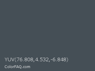 YUV 76.808,4.532,-6.848 Color is a dark blue color and the nearest color is River Bed #434c59. Hex code #454f56 and RGB value is rgb(69,79,86). In RGB color space, this color is composed of 27% red, 31% green, 34% blue, In CMYK color space, this color is composed of 20% cyan, 8% magenta, 0% yellow , 66% black , In HSL color space, this color has a hue angle of 205° , 11% saturation and 30% lightness.