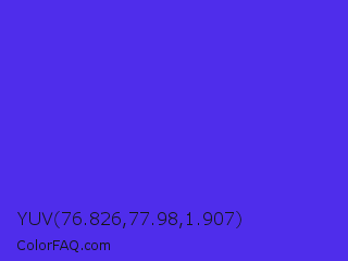 YUV 76.826,77.98,1.907 Color is a normal indigo color and the nearest color is Han Purple #5218fa. Hex code #4f2deb and RGB value is rgb(79,45,235). In RGB color space, this color is composed of 31% red, 18% green, 92% blue, In CMYK color space, this color is composed of 66% cyan, 81% magenta, 0% yellow , 8% black , In HSL color space, this color has a hue angle of 251° , 83% saturation and 55% lightness.