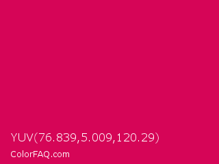YUV 76.839,5.009,120.29 Color is a normal rose color and the nearest color is Debian Red #d70a53. Hex code #d60557 and RGB value is rgb(214,5,87). In RGB color space, this color is composed of 84% red, 2% green, 34% blue, In CMYK color space, this color is composed of 0% cyan, 98% magenta, 59% yellow , 16% black , In HSL color space, this color has a hue angle of 336° , 95% saturation and 43% lightness.