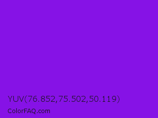 YUV 76.852,75.502,50.119 Color is a normal purple color and the nearest color is Blue Violet #8a2be2. Hex code #8612e6 and RGB value is rgb(134,18,230). In RGB color space, this color is composed of 53% red, 7% green, 90% blue, In CMYK color space, this color is composed of 42% cyan, 92% magenta, 0% yellow , 10% black , In HSL color space, this color has a hue angle of 273° , 85% saturation and 49% lightness.