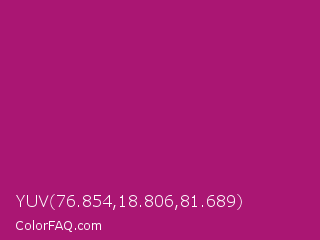 YUV 76.854,18.806,81.689 Color is a normal magenta color and the nearest color is Lipstick #ab0563. Hex code #aa1673 and RGB value is rgb(170,22,115). In RGB color space, this color is composed of 67% red, 9% green, 45% blue, In CMYK color space, this color is composed of 0% cyan, 87% magenta, 32% yellow , 33% black , In HSL color space, this color has a hue angle of 322° , 77% saturation and 38% lightness.
