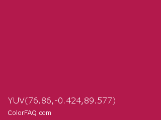 YUV 76.86,-0.424,89.577 Color is a normal rose color and the nearest color is French Wine #ac1e44. Hex code #b3194c and RGB value is rgb(179,25,76). In RGB color space, this color is composed of 70% red, 10% green, 30% blue, In CMYK color space, this color is composed of 0% cyan, 86% magenta, 58% yellow , 30% black , In HSL color space, this color has a hue angle of 340° , 75% saturation and 40% lightness.