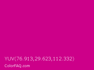 YUV 76.913,29.623,112.332 Color is a normal magenta color and the nearest color is Red Violet #c71585. Hex code #cd0089 and RGB value is rgb(205,-0,137). In RGB color space, this color is composed of 80% red, 0% green, 54% blue, In CMYK color space, this color is composed of 0% cyan, 100% magenta, 33% yellow , 20% black , In HSL color space, this color has a hue angle of 320° , 100% saturation and 40% lightness.